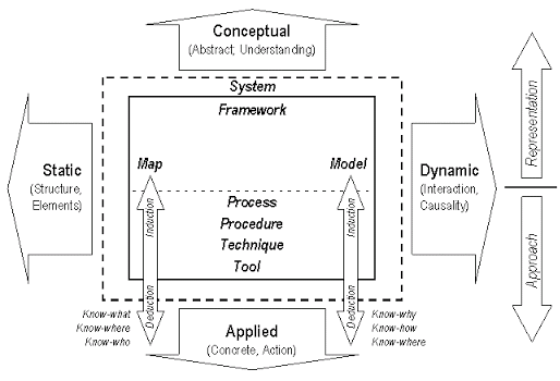 Nuestro segundo foco está en mirar los negocios de nuestros clientes identificando claramente sus componentes claves, para lo cual usamos una mirada visual holística que considera esquemas visuales como el marco “Management representations and approaches frameworks” que presentamos a continuación.